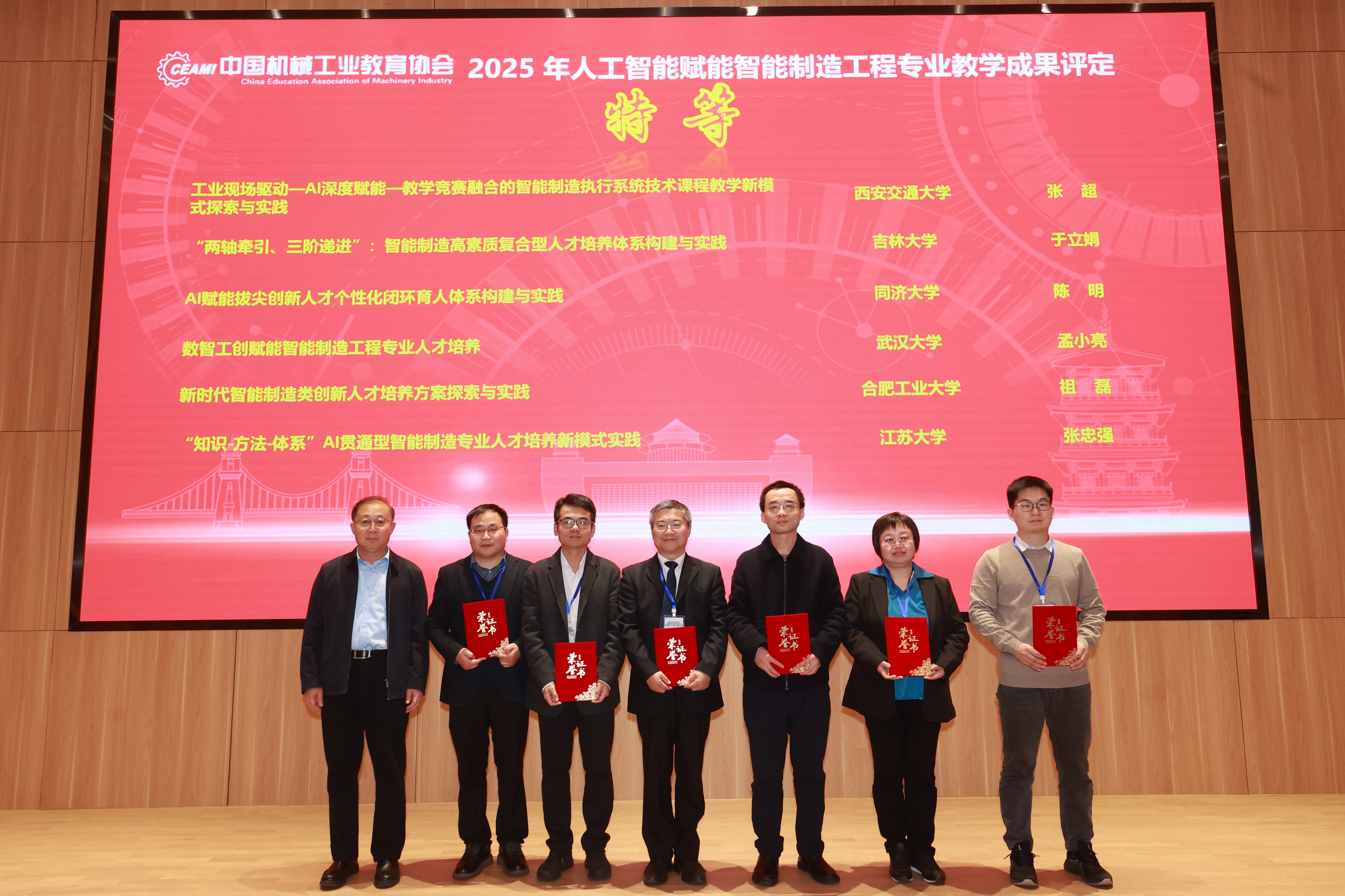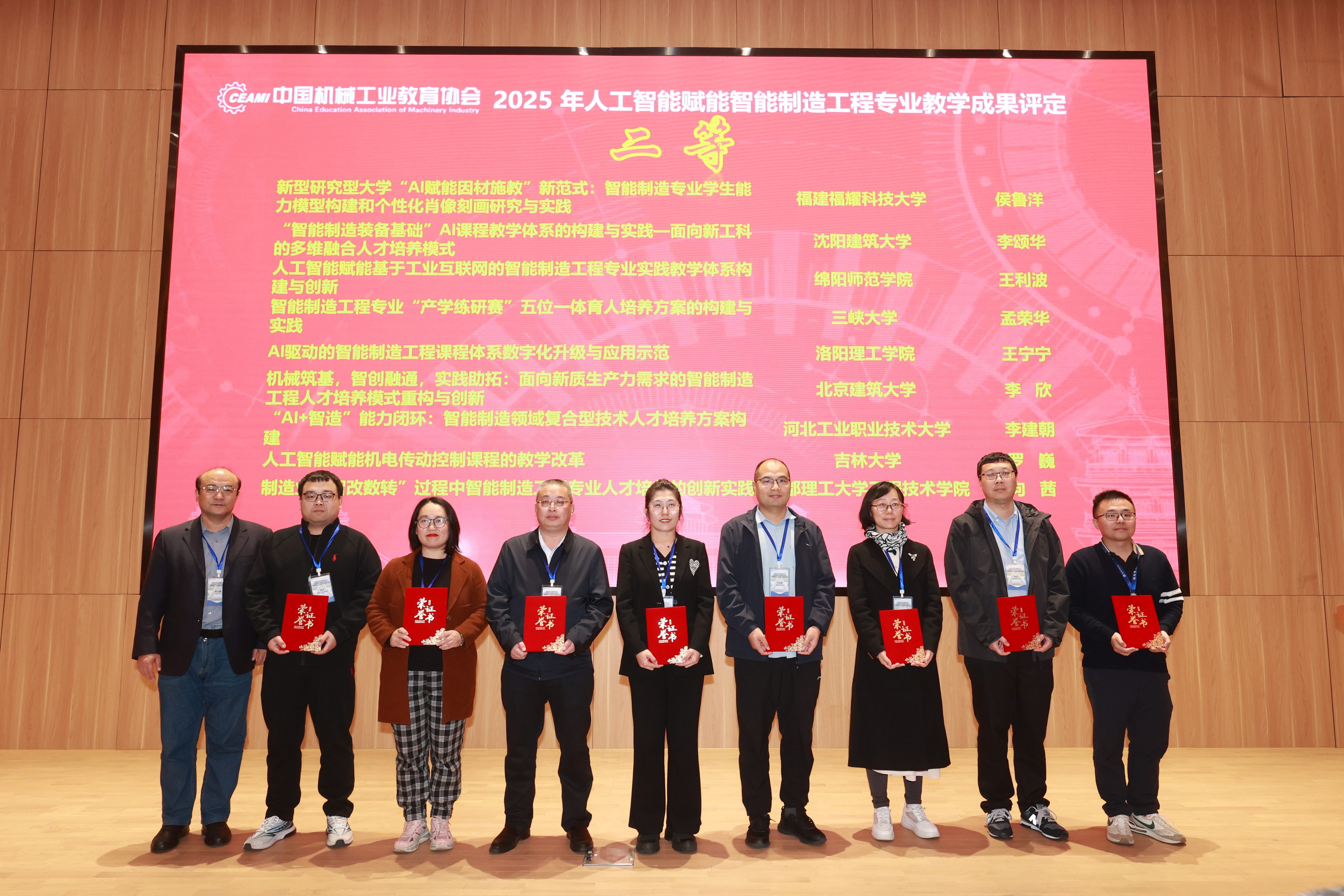 会议期间举办了2025年人工智能赋能智能制造工程专业教学成果颁奖仪式。经过严格评审,全国共有53项教学成果脱颖而出。其中,我院于立娟教授主持的《两轴牵引、三阶递进:智能制造高素质复合型人才培养体系构建与实践》荣获特等奖;罗巍教授负责的《人工智能赋能机电传动控制课程的教学改革》荣获二等奖,体现了我院在智能制造教学改革方面的积极探索与扎实成效。