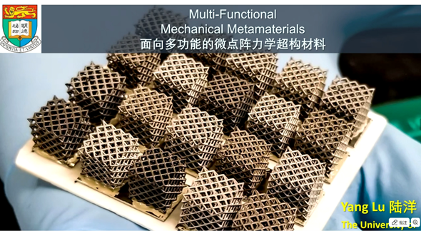 陆洋教授的报告题目是《面向多功能的微点阵力学超材料》。机械超材料通过其微纳结构的设计实现对宏观力学性能的调控,为高性能的结构设计和新颖的多功能设计提供了近乎无限的可能性。在过去金属微纳点阵超材料的研究基础上,陆洋教授更进一步展示了通过对3D打印聚合物微点阵进行部分热解碳化,得到一种高强高韧的碳点阵力学超材料,这种刚柔并济的碳点阵材料具有很好的生物兼容性。再通过对其表面进行功能性半导体镀膜,经过组装成为一种具有优异机械性能和可靠性的多功能器件,展现了力学超材料可通过人工构建其几何及材料特性来调控整体机械和功能特性的能力。