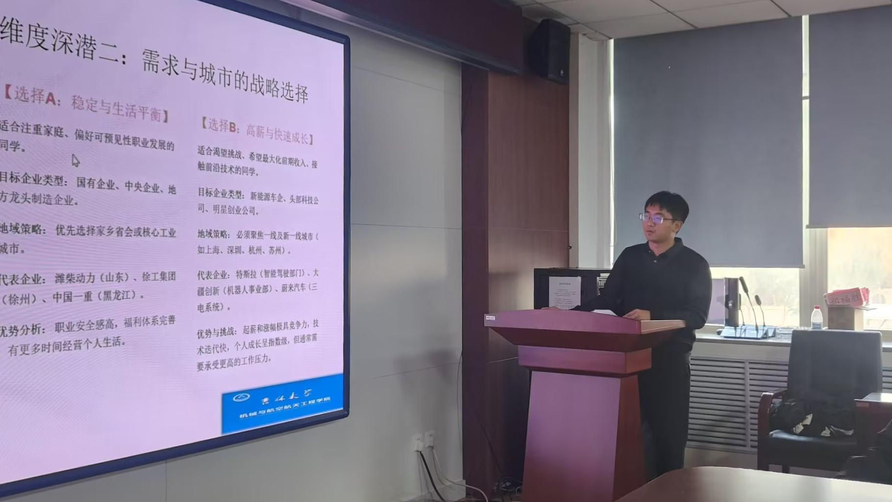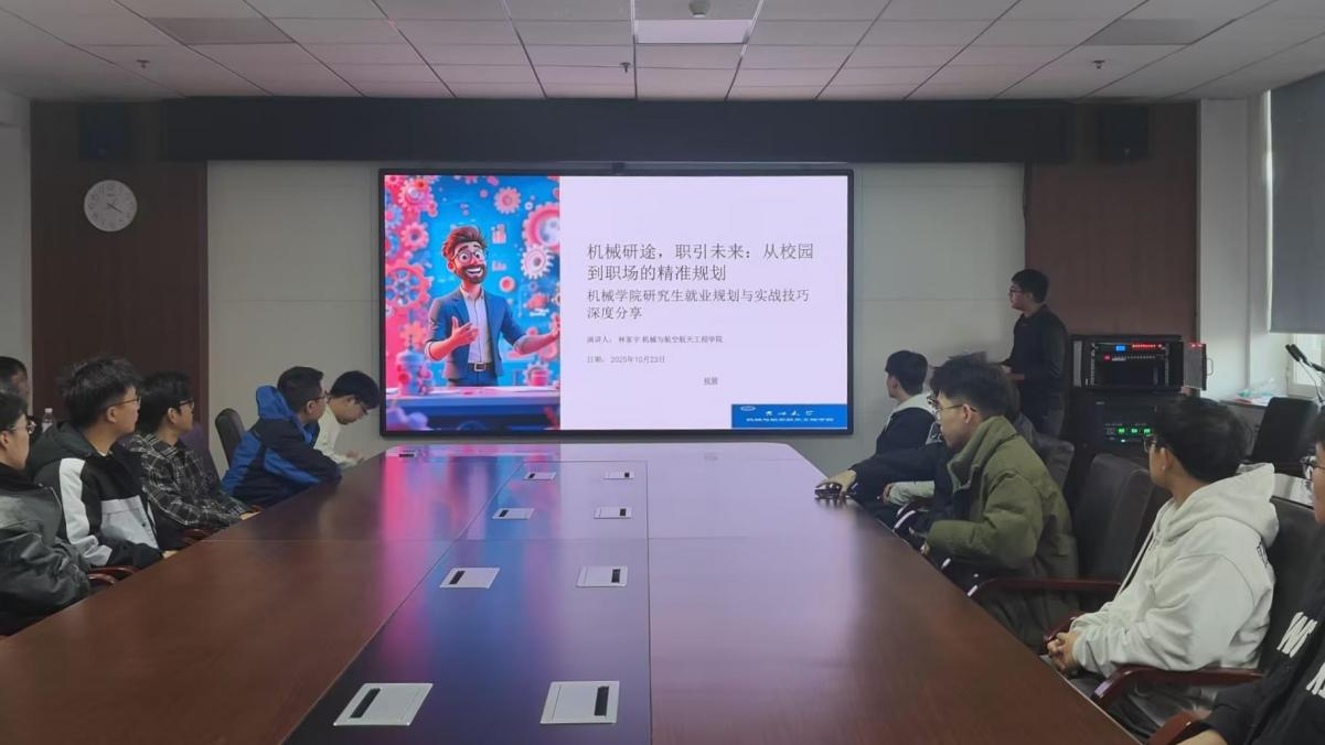 为帮助研究生明晰职业方向、提升就业竞争力,实现从校园到职场的顺利过渡,10月24日下午,机械与航空航天工程学院在逸夫教育大楼举办“机械研途职引未来”研究生就业规划专题分享会。本次活动由院研究生会组织,林家宇同学主讲,2024级、2025级部分研究生参与交流。
