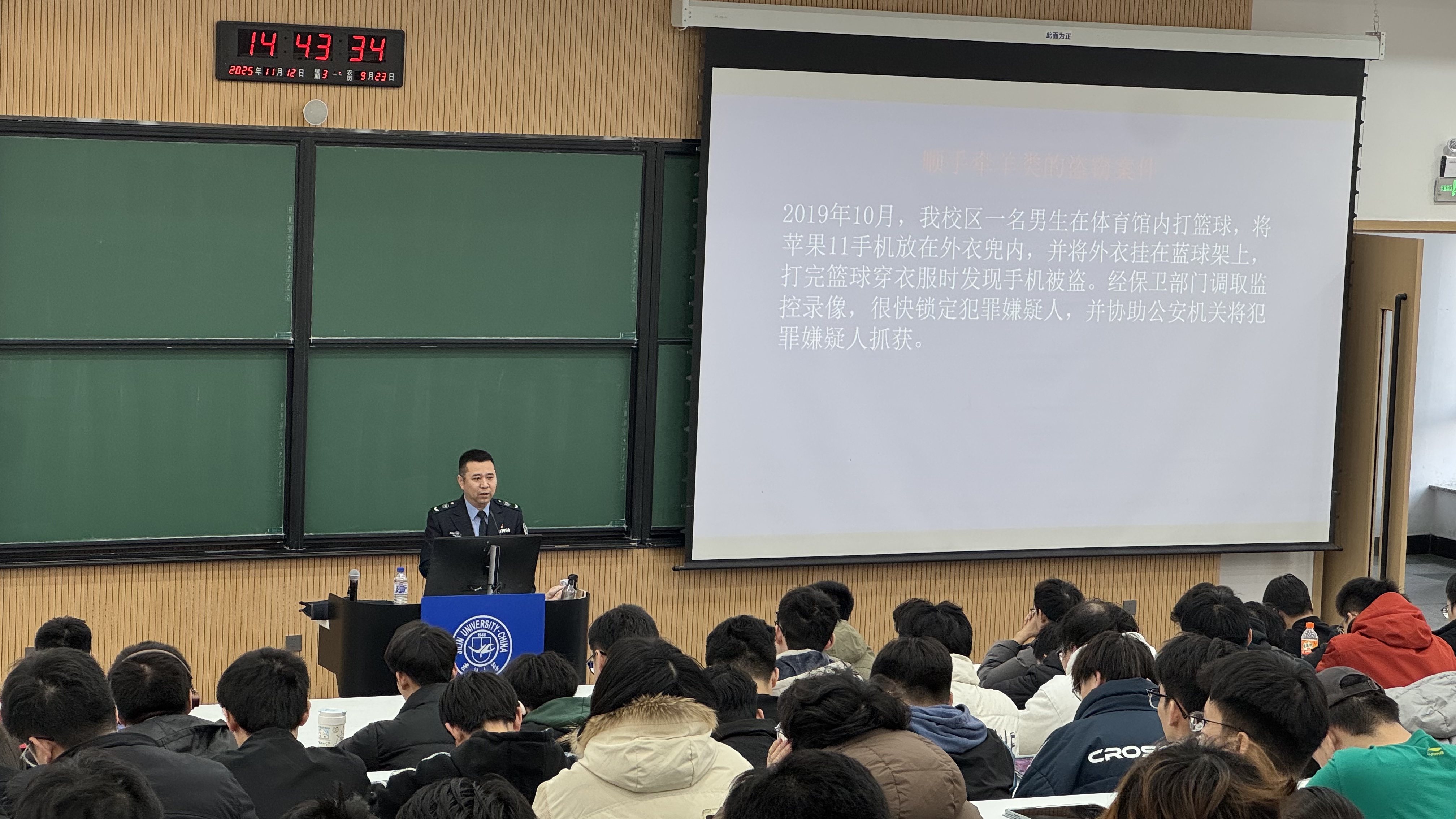 宣讲会上,刘海江老师围绕消防安全主题,结合高校典型火灾案例,详细讲解了宿舍、实验室等场所的火灾风险点及预防措施,并强调了火场逃生自救的基本要领。田刚老师则聚焦防范电信网络诈骗,通过剖析近期高发的网络刷单、虚假交易、冒充客服等真实案例,系统介绍了常见诈骗模式的特征与识别方法,建议同学们在日常生活中提高警惕,及时核实信息,切实提升对各类诈骗手段的防范能力,守护个人信息与财产安全。