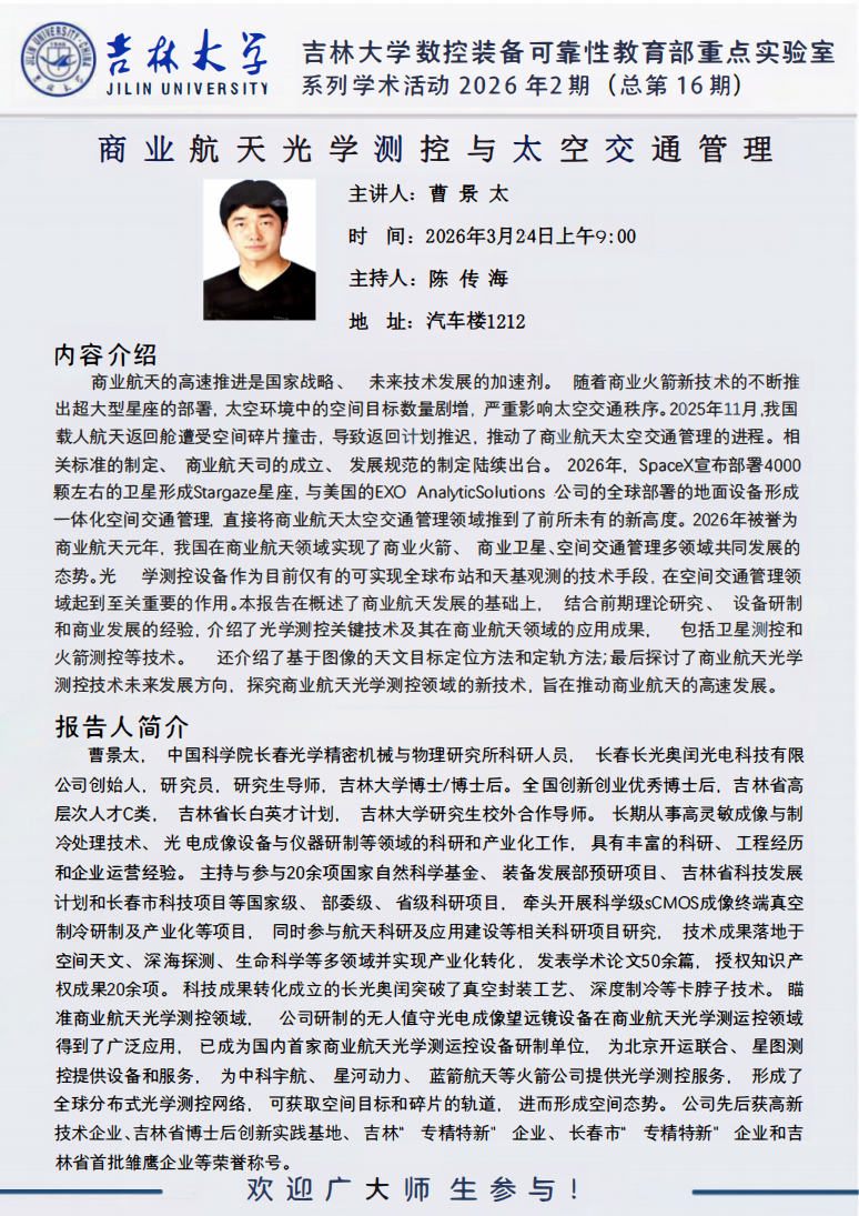 吉林大学数控装备可靠性教育部重点实验室系列学术活动2026年2期(总第16期)-商业航天光学测控与太空交通管理