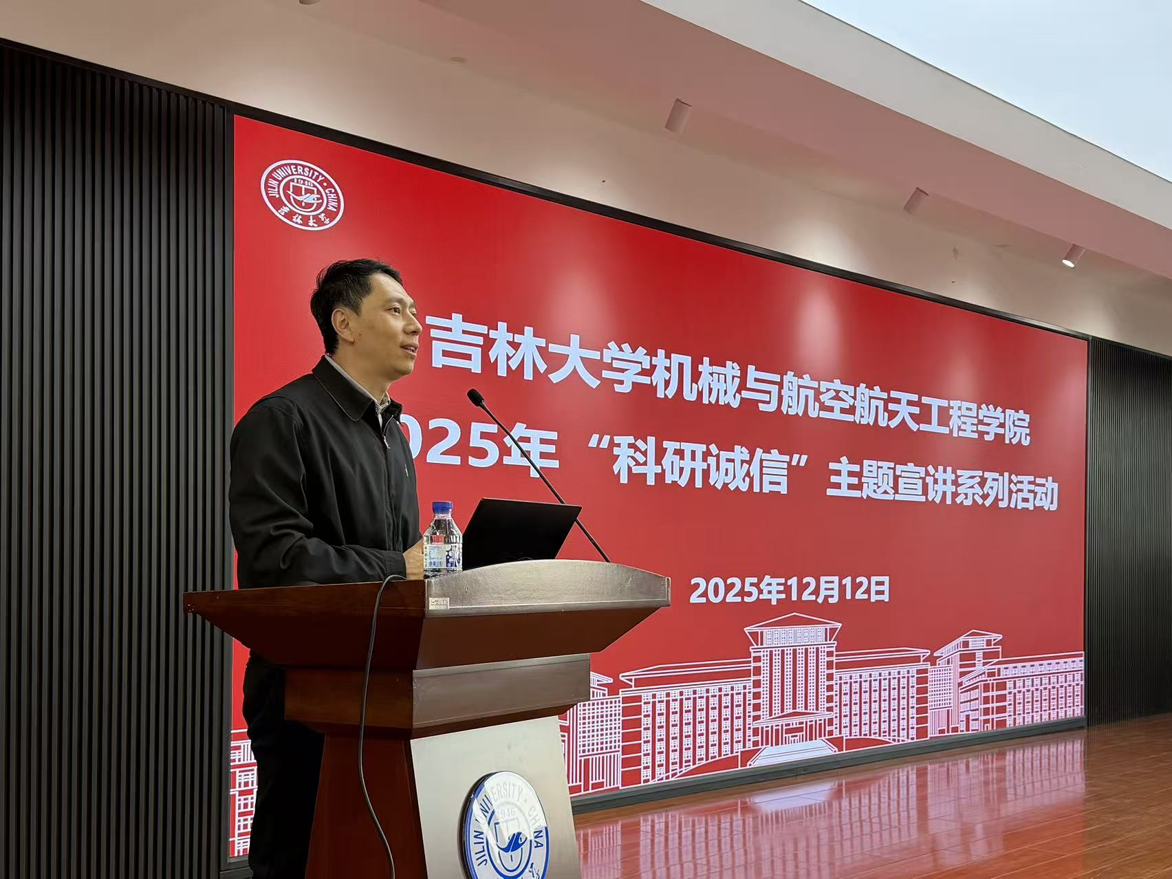 为深入贯彻落实国家科研诚信建设要求,引导全院师生树立严谨求实的科研态度,筑牢学术道德底线,2025年12月12日,学院在南岭校区逸夫机械材料馆802室举办2025年“科研诚信”主题宣讲系列活动。活动特邀吉林大学唐敖庆卓越教授、博士生导师、校学术委员会副主任委员于化东,吉林大学唐敖庆卓越教授、博士生导师黄虎担任主讲嘉宾。学院院长吴文征、院科研办公室主任贾继伟出席活动,学院教职工代表及各年级硕博研究生代表参加此次宣讲,活动由贾继伟主持。