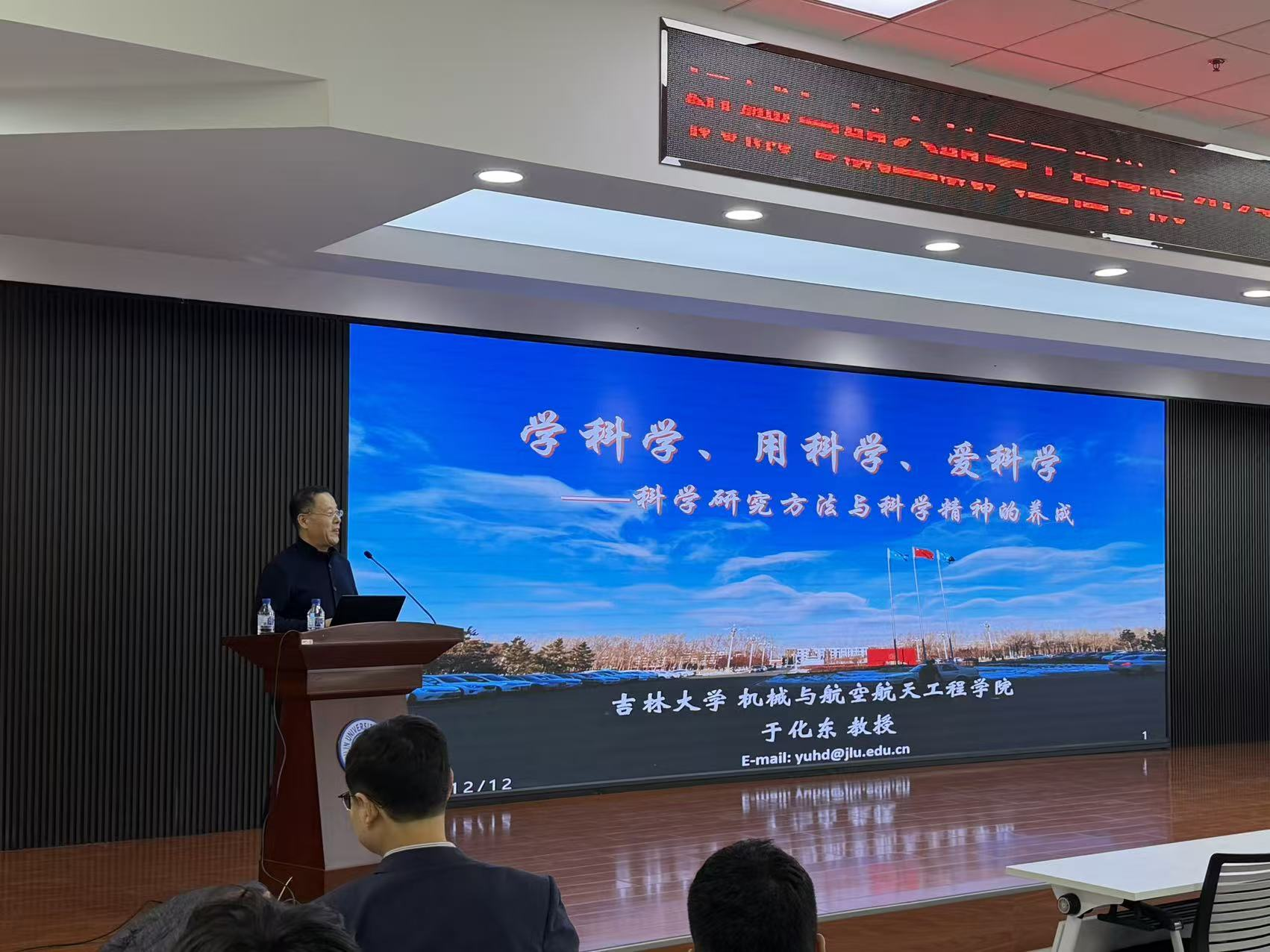 于化东教授以《学科学、用科学、爱科学——科学研究方法与科学精神养成》为题展开专题宣讲。他从机械工程学科发展历程中的经典案例切入,系统讲解了科学研究的基本逻辑、方法体系以及创新思维的培养路径。于教授着重强调,科学精神的核心不仅在于追求真理的执着,更在于恪守诚信的自觉,他结合学术研究中的规范要求,叮嘱同学们在文献引用、数据采集、成果署名等关键环节严守学术底线,养成“严谨务实、精益求精”的科研习惯。