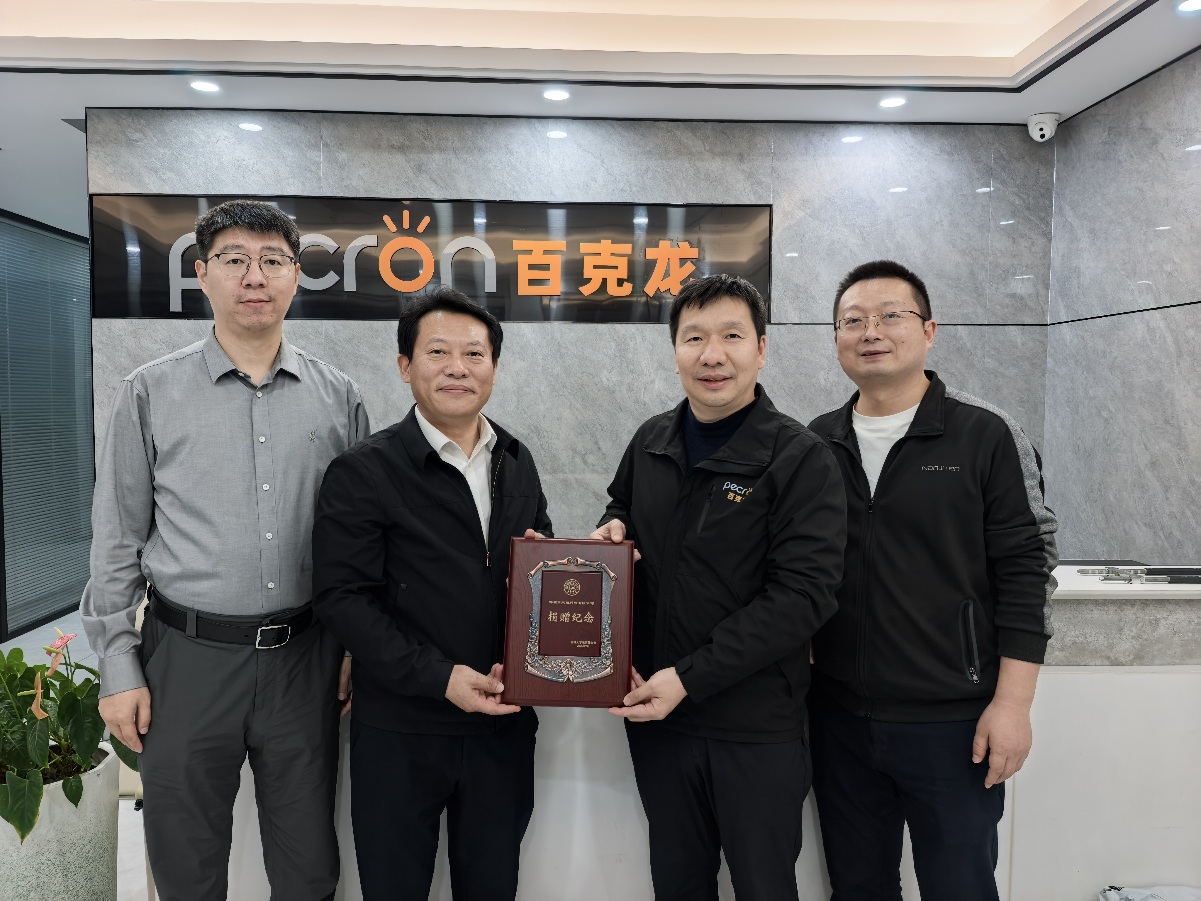 在深圳市百克龙科技有限公司,公司法人、学院1999级校友史为新与学院1999级校友陈明共同接待郑书记一行。该公司是一家专注于户外便携式电源、逆变器等电力设备的国家级高新技术企业和专精特新企业。公司以“PECRON”为核心品牌,致力于为户外露营、应急备灾、移动办公等场景提供绿色、可靠的离网供电解决方案。其产品远销全球数十个国家和地区,展现出强大的研发实力和品牌影响力。公司于2024年向学院捐赠30万元设立“百克龙奖学金”,奖励学院优秀学子。郑福胜代表学院向史为新校友情系母校、捐资助学的善举表示感谢并颁发捐赠纪念牌。